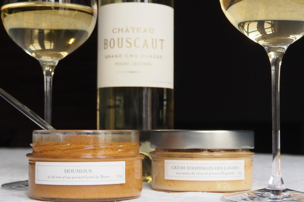 Pour terminer votre visite, nous vous proposons une dégustation de nos vins accompagnés de deux tartinables Domaine Terra. Dégustez le Château Bouscaut blanc accompagné d’une crème d’asperges des Landes aux zestes de citron et au piment d’Espelette, un accord tout en fraîcheur. Puis appréciez le Château Bouscaut rouge avec un houmous à l’ail noir et au piment fumé du Béarn, un accord qui vous enveloppera de notes chaudes et orientales.